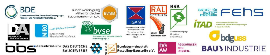 Das Schreiben haben unterzeichnet die Bundesgemeinschaft Recycling-Baustoffe (BGRB), der Bundesverband Baustoffe – Steine und Erden (BBS), der Bundesverband der Deutschen Entsorgungs-, Wasser- und Kreislaufwirtschaft (BDE), der Bundesverband der Deutschen Gießerei-Industrie (BDG), der Bundesverband Mineralische Rohstoffe (MIRO), der Bundesverband Sekundärrohstoffe und Entsorgung (bvse), die Bundesvereinigung Mittelständischer Bauunternehmen (BVMB), die Bundesvereinigung Recycling-Baustoffe (BRB), der Deutsche Abbruchverband (DA), die Deutsche Gesellschaft für Abfallwirtschaft (DGAW), die Gütegemeinschaft Metallhüttenschlacken (GGMHS), der Hauptverband der Deutschen Bauindustrie (HDB), die Interessensgemeinschaft der Aufbereiter und Verwerter von Müllverbrennungsschlacken (IGAM), die Interessensgemeinschaft der Thermischen Abfallbehandlungsanlagen in Deutschland (ITAD), der Zentralverband des Deutschen Baugewerbes (ZDB) sowie das FEhS – Institut für Baustoff-Forschung.