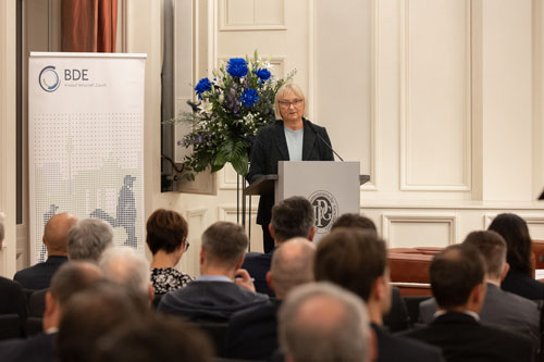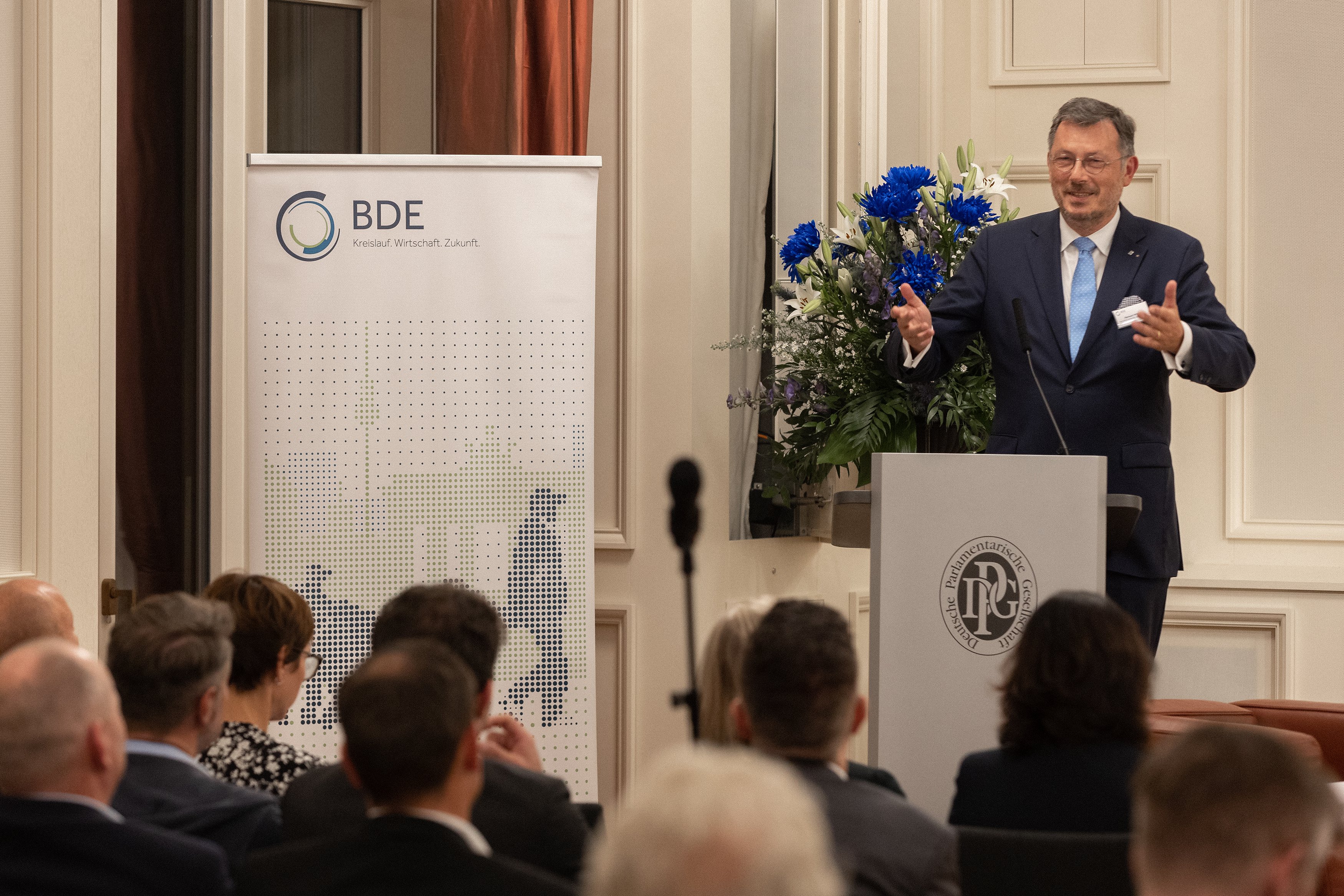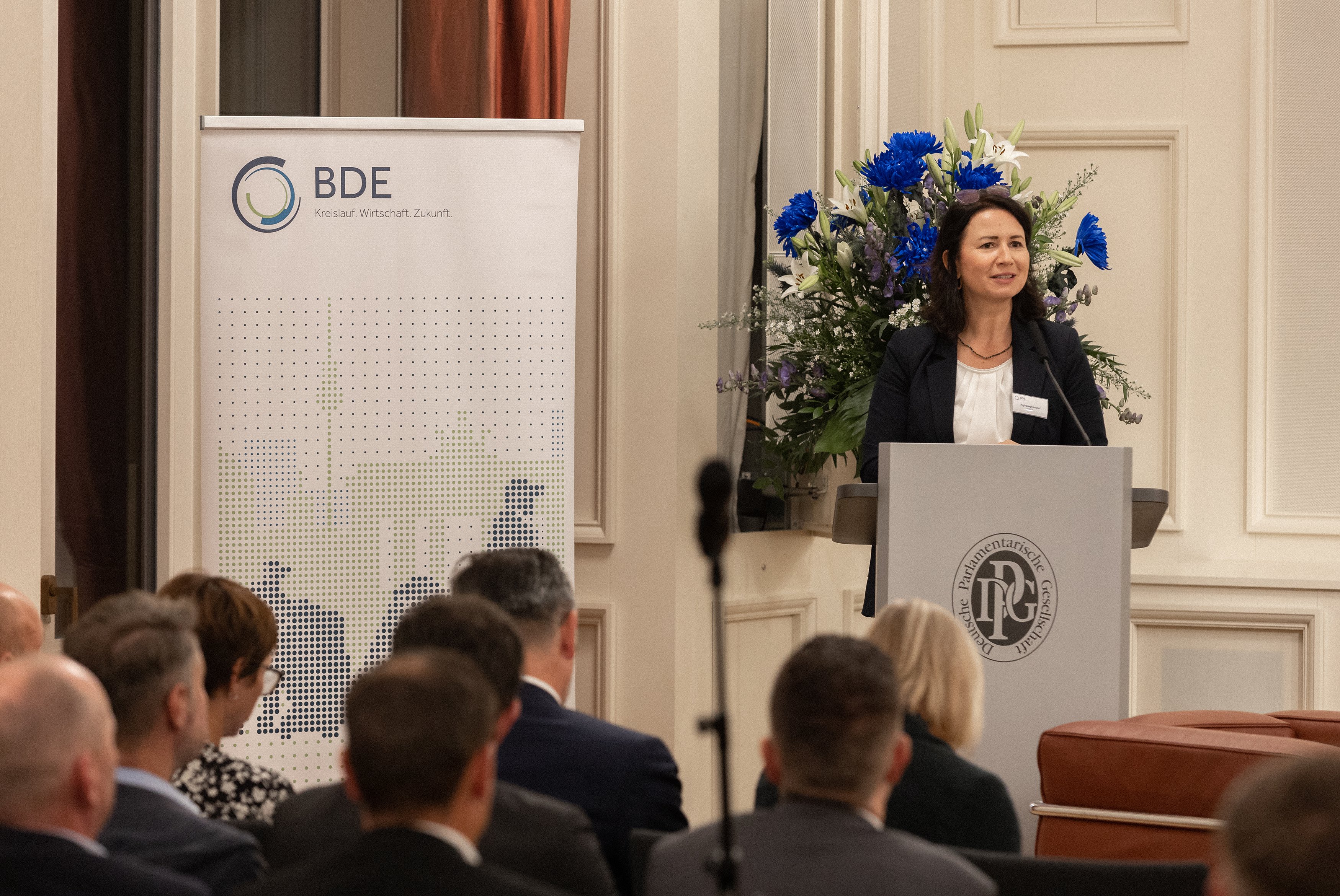 Eröffnet wurde der Abend in der Deutschen Parlamentarischen Gesellschaft in Berlin von BDE-Präsidentin Anja Siegesmund: „Eine kluge Regulatorik schafft Märkte. Für eine zukunftssichere Rohstoffversorgung und mehr Klimaschutz brauchen wir klare politische Rahmenbedingungen und einen verbesserten Gesetzesvollzug. Der BDE setzt sich deshalb bei der Umsetzung der NKWS besonders für Mindesteinsatzquoten von Rezyklaten ein, die Investitionen in eine bessere Recyclinginfrastruktur fördern. Außerdem braucht es eine öffentliche Hand, die eine Verwendung von Recyclingrohstoffen bei Ausschreibungen von Anfang an mitdenkt und berücksichtigt. So kann unsere hochinnovative und gleichzeitig traditionsbewusste Branche weiterhin der Motor für eine funktionierende Kreislaufwirtschaft in Deutschland und Europa bleiben. Nur so können wir ihr volles Potenzial für Wirtschaftswachstum und Beschäftigung, für Rohstoffsicherung und Klimaschutz heben.“