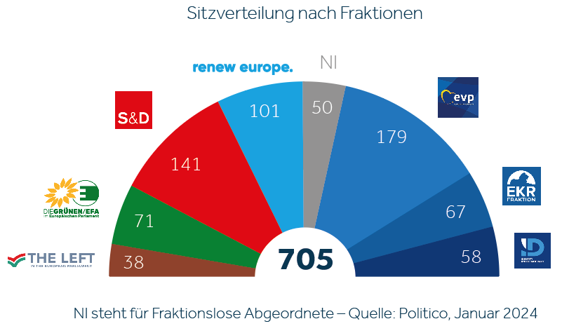 Dazu könnten auch Friktionen unter den rechten Parteien im Europaparlament beitragen: Die ID-Fraktion hat kürzlich drastische Schritte gegen ihr Mitglied AfD (Alternative für Deutschland) eingeleitet und deren Vertreter von der Fraktion ausgeschlossen. Begründet wurde der Rauswurf mit den AfD-Skandalen, darunter z.B. Korruptionsvorwürfe gegen den AfD-Spitzenkandidaten für die Europawahl Maximilian Krah. Die französische Partei Rassemblement National (RN, ehemals Front National), geführt von Marine Le Pen, hatte sich wiederholt in den letzten Monaten von der AfD distanziert und schlussendlich Ende Mai den Rauswurf angeregt. Darüber hinaus verfolgt sie die Idee, dass der RN nach der Wahl in die EKR-Fraktion wechseln könnte. Ob die EKR-Fraktion den Rassemblement National bei sich aufnehmen wird, ist noch ungewiss – bisher hat Georgia Meloni, Ministerpräsidentin von Italien und Präsidentin der Fratelli d’Italia (stärkste Kraft der EKR), sich mit einer anderen rechten Partei Frankreichs, der Reconquête, verbündet.